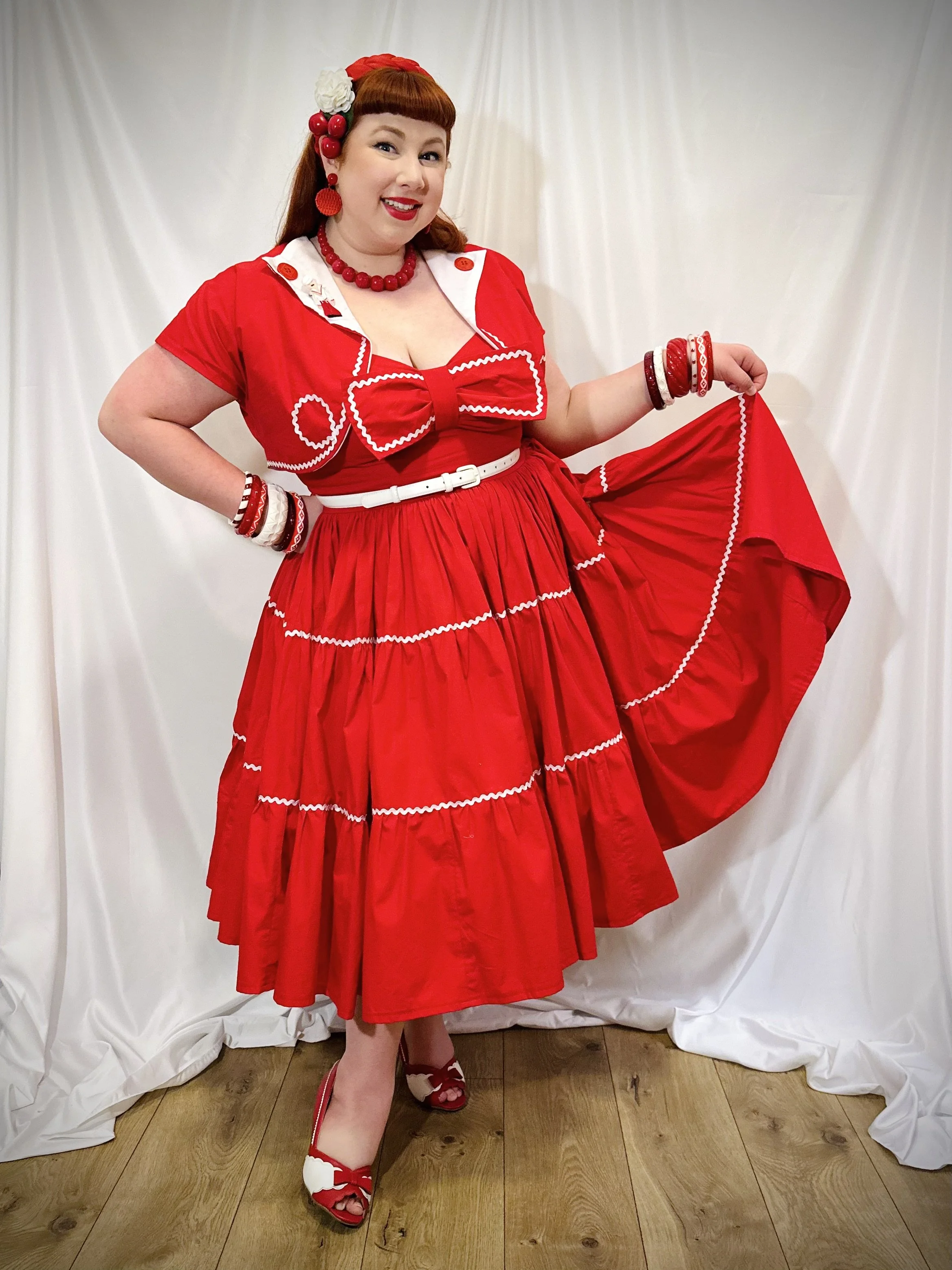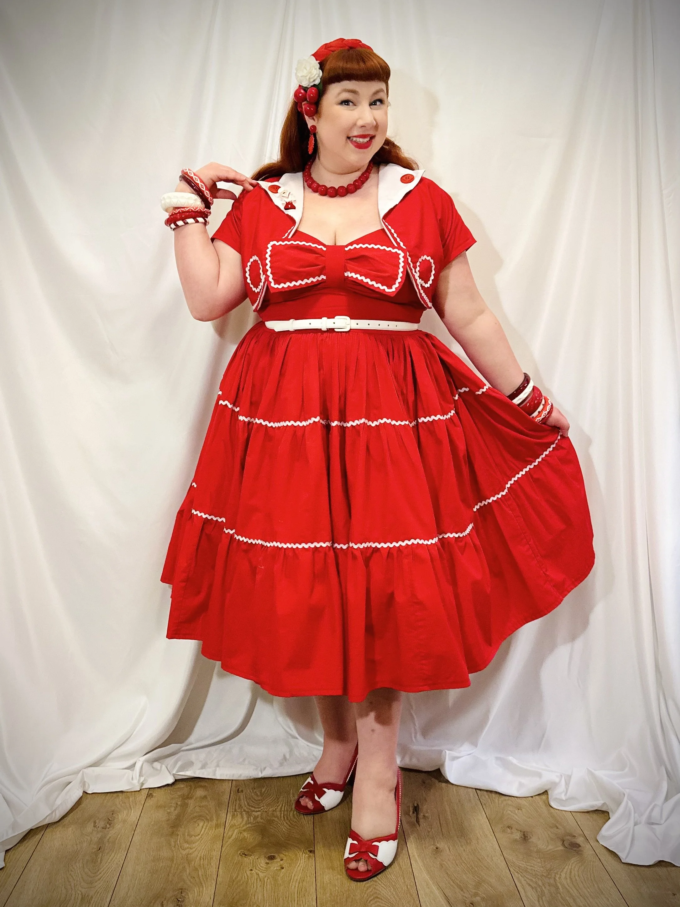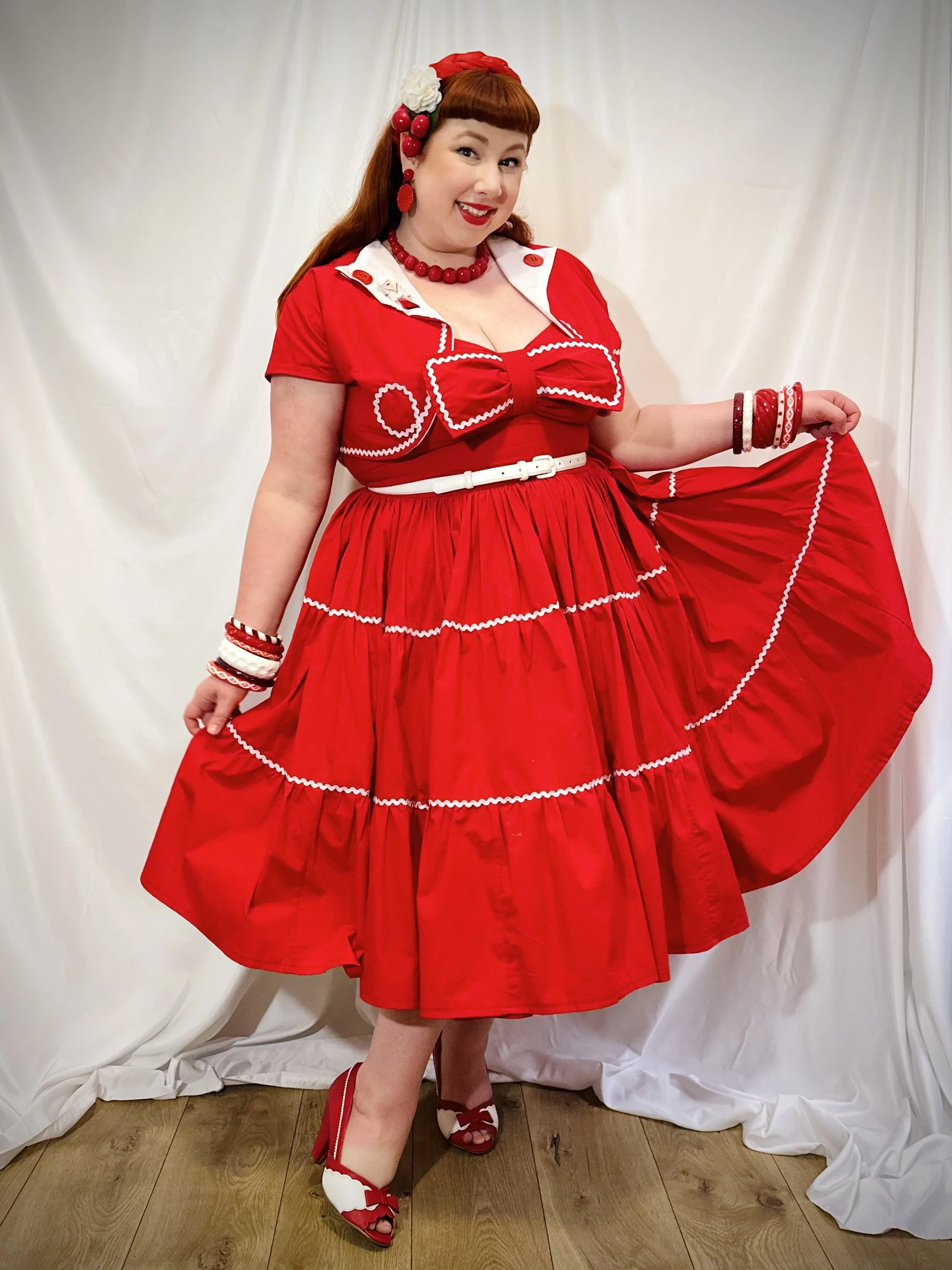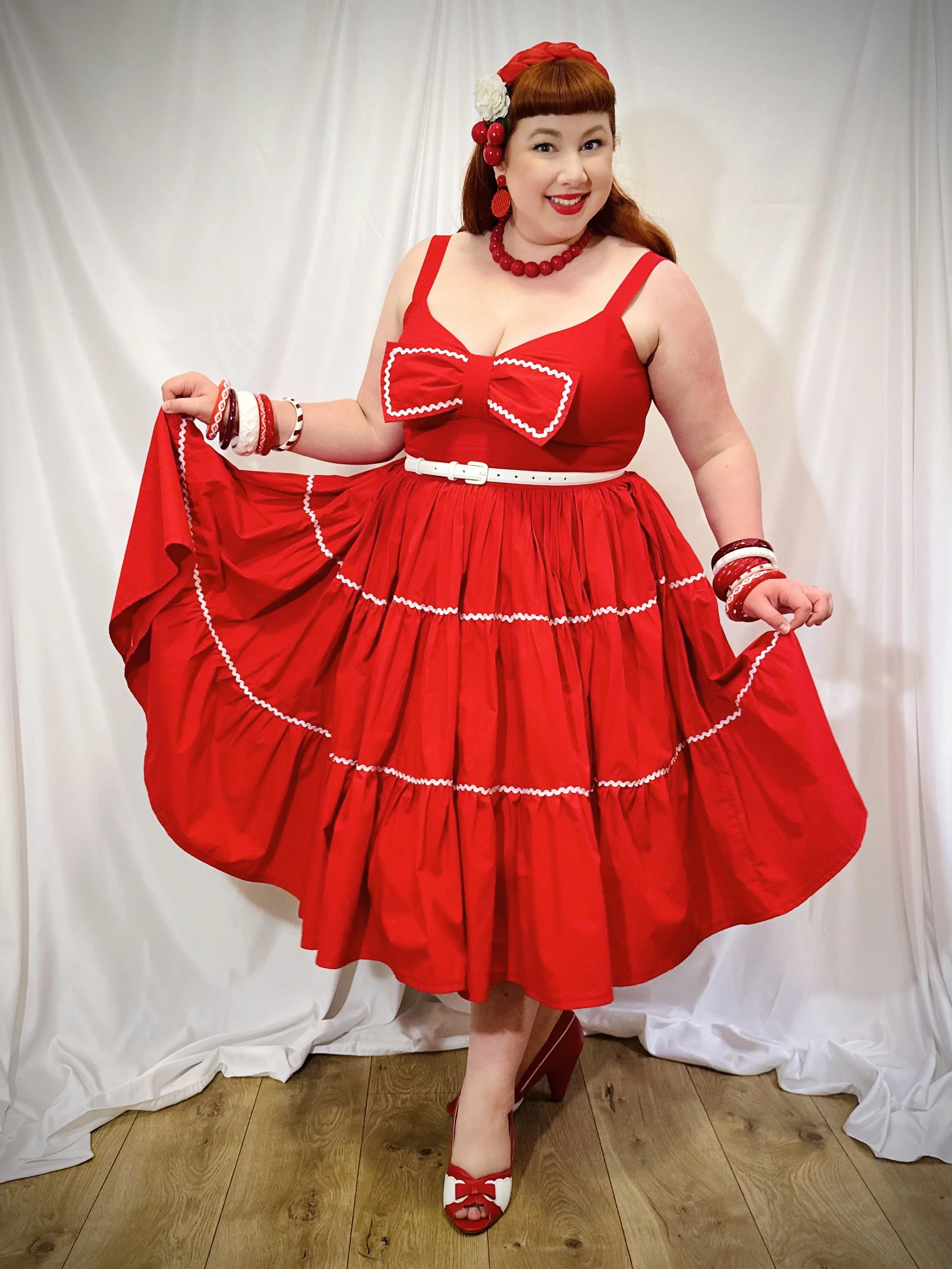 For the last couple of years I’ve made myself a new dress to wear on my Birthday. This past year, I decided to combine some of my favorite things— red, rick-rack, and bows— into one dress!
