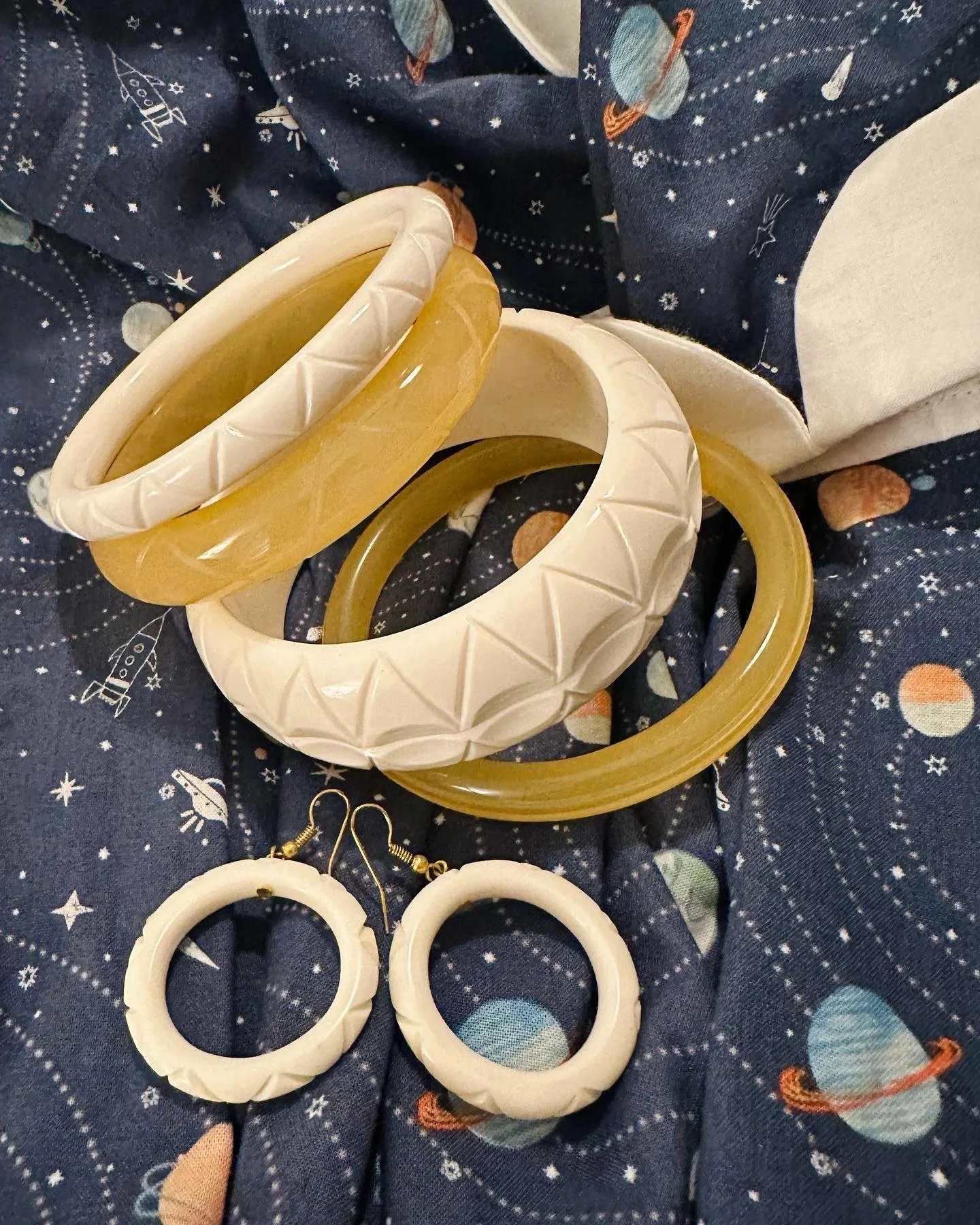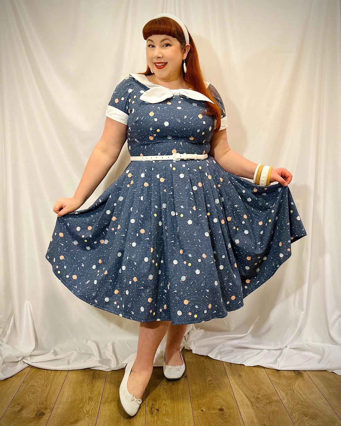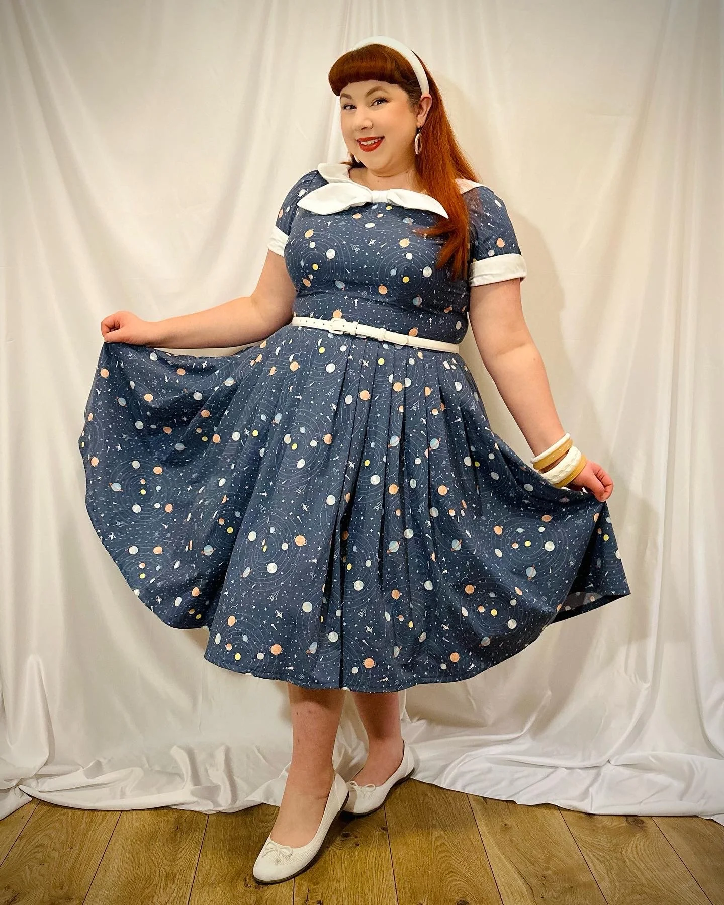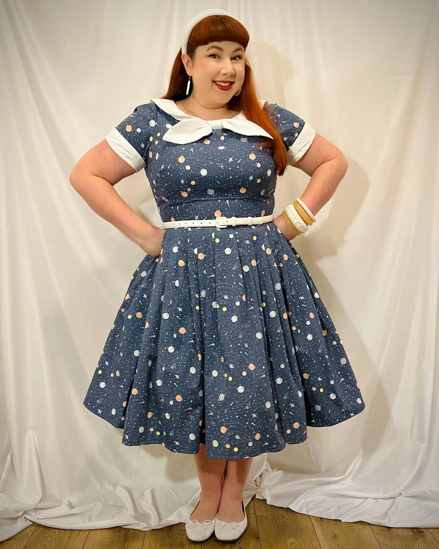 I finally resolved to make it, and pulled a solar system fabric out of my stash that I loved when I bought, and then was immediately stumped about what to make it in. It seemed like it would be a good fit with the scarf collar option, and of course I had to try out the cuff on the short sleeve to tie in the white contrast from the scarf color!